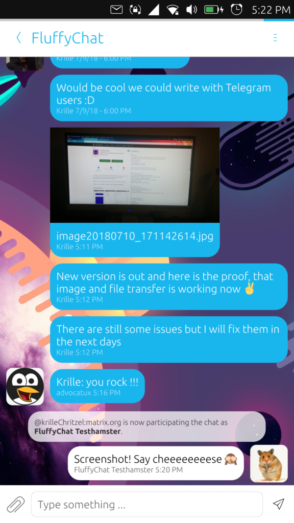 New to me, fluffychat is a "Simple Matrix Messenger for Ubuntu Touch". The design philosophy for this app is focused on simplicity, and the hope is for it to complement uMatriks, another Ubuntu Touch client.