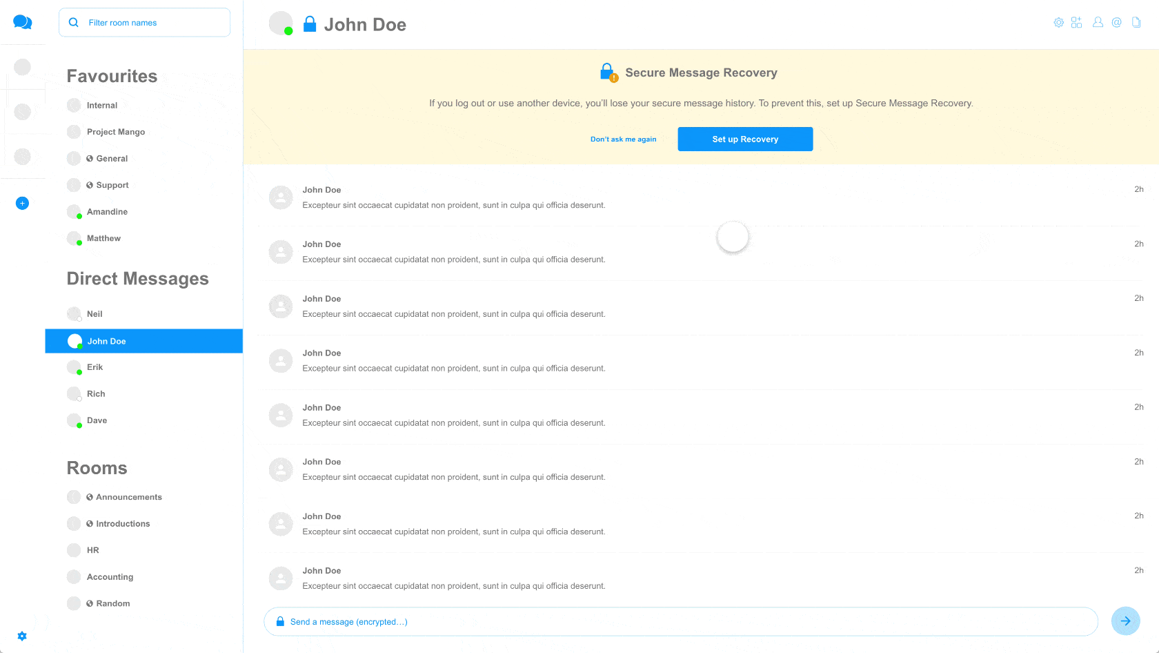- Access their encrypted message history using Secure Message Recovery, by storing encrypted message keys on their homeserver.