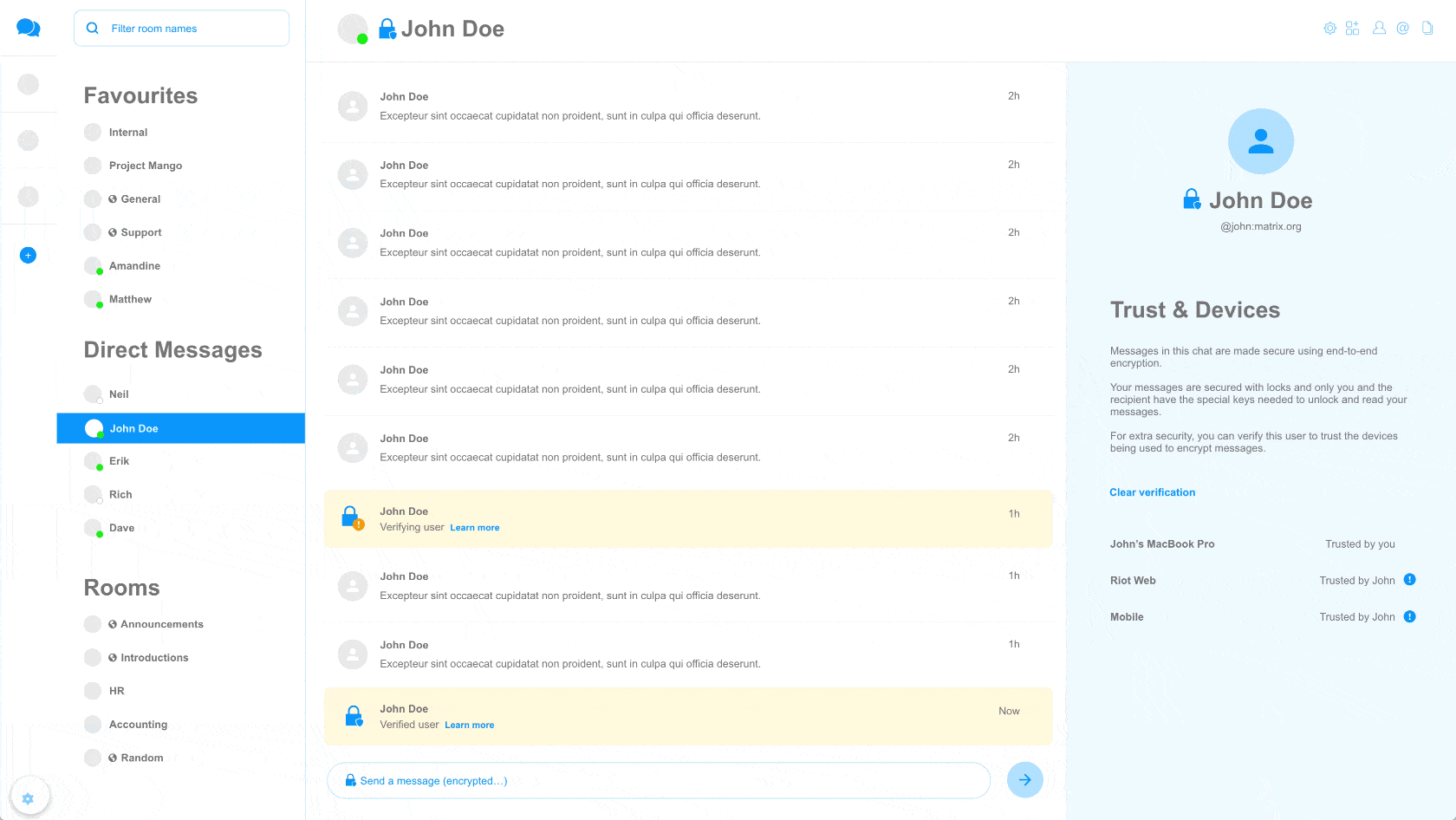 Let's dive in to some of the fundamental concepts we'll be putting forward to deliver a default end-to-end encryption experience that makes sense for most modern users. In this post we'll look at an overview of work-in-progress wireframes, in the spirit of designing in the open and gathering feedback from the wider Matrix community. Please note that these don't represent the actual interface design.