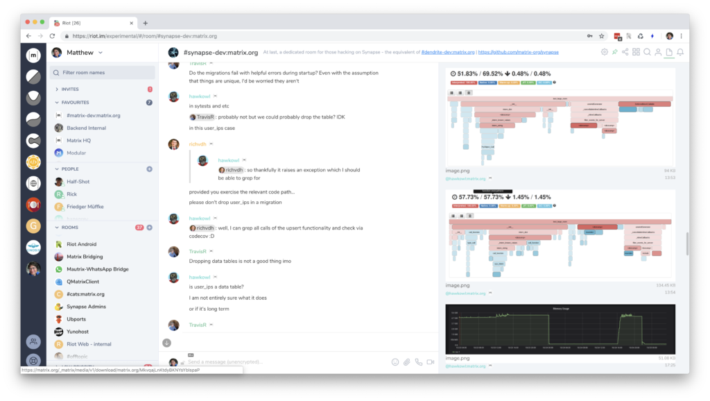 Also on the spec side of things, it's worth noting that a lot of effort went into improving performance for clients in the form of the Lazy Loading Members MSC. This ended up consuming a lot of time over the summer as we updated Synapse and the various matrix-*-sdks (and thus Riot) to only calculate and send details to the clients about members who are currently talking in a room, whereas previously we sent the entire state of the room to the client (even including users who had left). The end result however is a 3-5x reduction in RAM on Riot, and a 3-5x speedup on initial sync. The current MSC is currently being merged as we speak into the main spec (thanks Kitsune!) for inclusion in upcoming CS API 0.5.