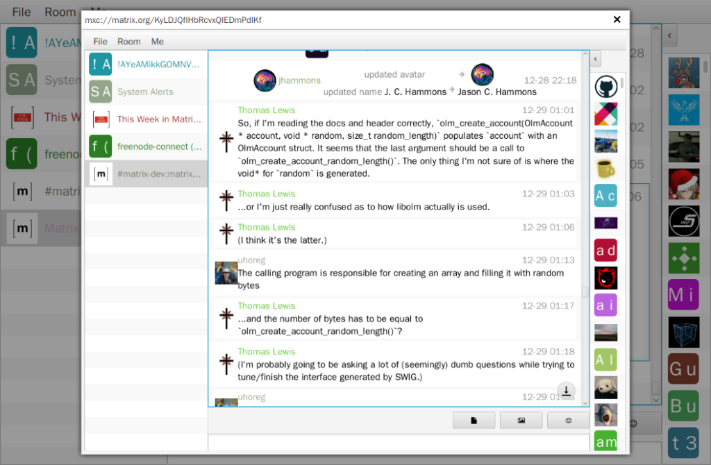 matrix-client.el gained more room sorting options and a /priority command to set room priority. It also includes a workaround for a Google Chrome drag-and-drop bug on Linux, so now Chrome users can drag-and-drop URLs, files, and images directly into room buffers to upload them.