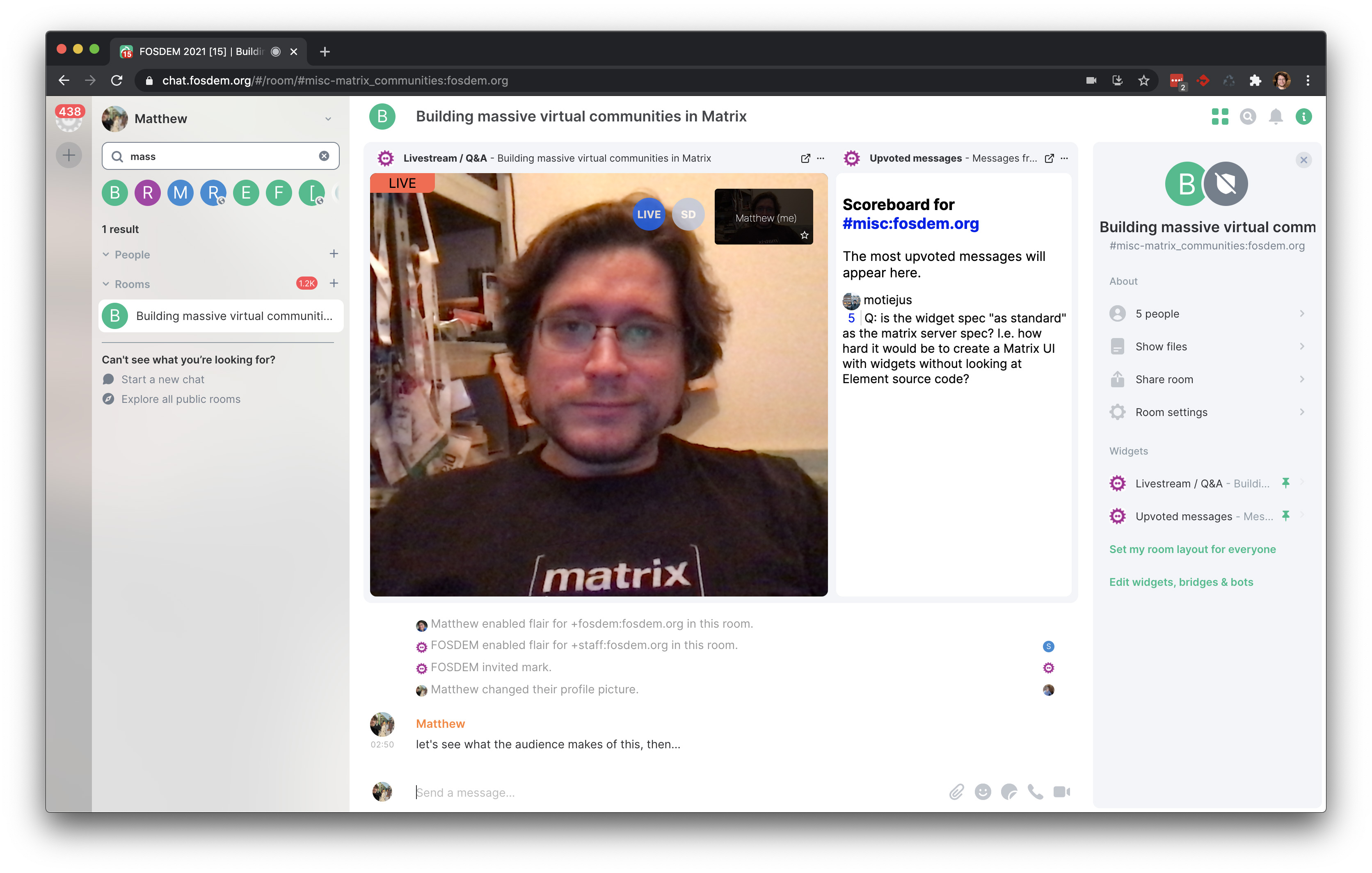 Just over a week ago we had the honour of using Matrix to host FOSDEM: the world's largest free & open source software conference. It's taken us a little while to write up the experience given we had to recover and catch up on business as usual... but better late than never, here's an overview of what it takes to run a ~30K attendee conference on Matrix!
