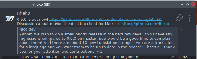 Nheko now also finally supports pinned messages! Most of you probably don't know, but that feature has pretty much always been in the matrix spec, but very few clients expose it. Today Nheko joins that rank! It's part of our goal to provide better support for building communities. Topics can be quite limiting, because they can only contain plain text. Pinned messages allow for much more creative freedom! They can also be encrypted, while state events currently never are, but the key for that isn't reshared, so currently experience in encrypted rooms is a tradeoff. Maybe we'll go for an encrypted description event in the future, but for now this seems to be a good solution to bridge the gap.