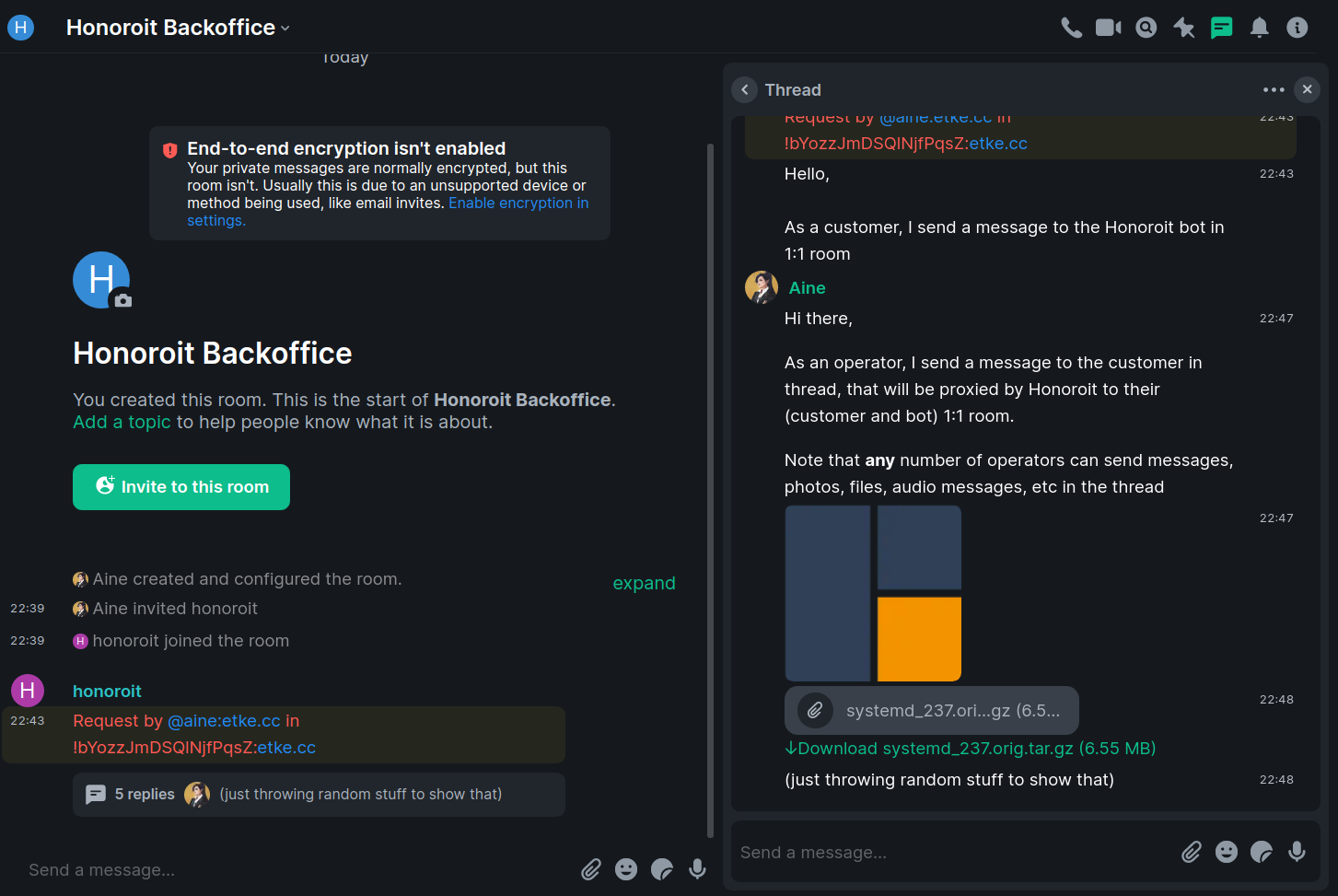 Honoroit is a helpdesk matrix bot with end-to-end encryption support, that utilizes MSC3440 (Threading) to act as a proxy between a customer (any matrix user) and your backoffice (users added in special room), each customer's room = thread in a backoffice room, where multiple operators can send messages to the same customer at once.