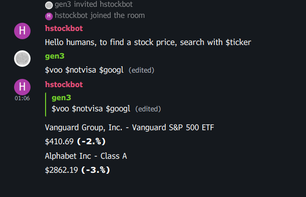 - Searches messages for $stocks mentioned, then formats and replies the current price and daily percent change for all the tickers in the message Screenshot below