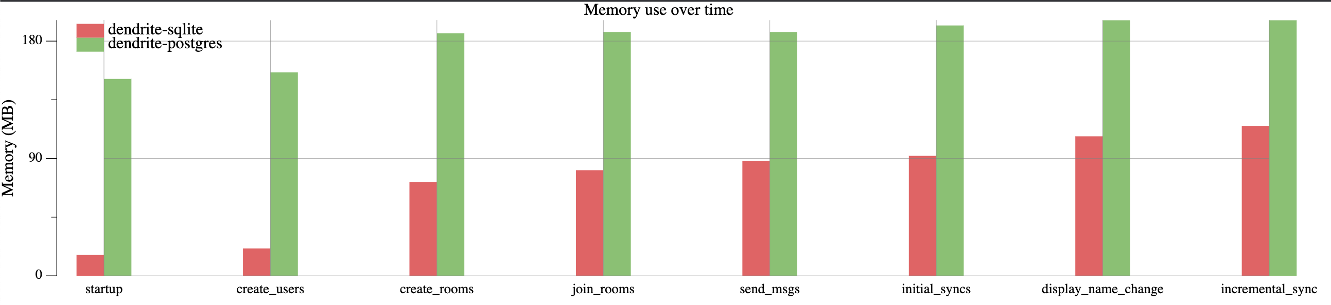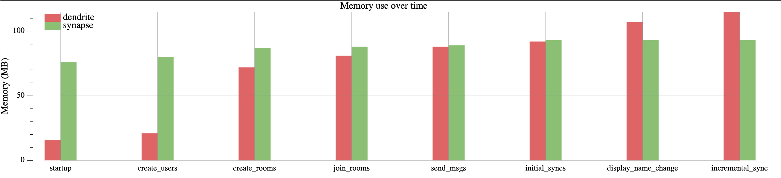 I have been asked by numerous people over months if there are any kind of graphs comparing Synapse and Dendrite. Up until now, my answer has been "as far as I know, no". However, this got me thinking whether I can use Complement to engineer some kind of performance testing infrastructure. After hacking on it for a day or two, I can now share some of the work I've done in this area. There now exists two new binaries in the Complement repo: perftest and perfgraph. The former will run some tests and output a