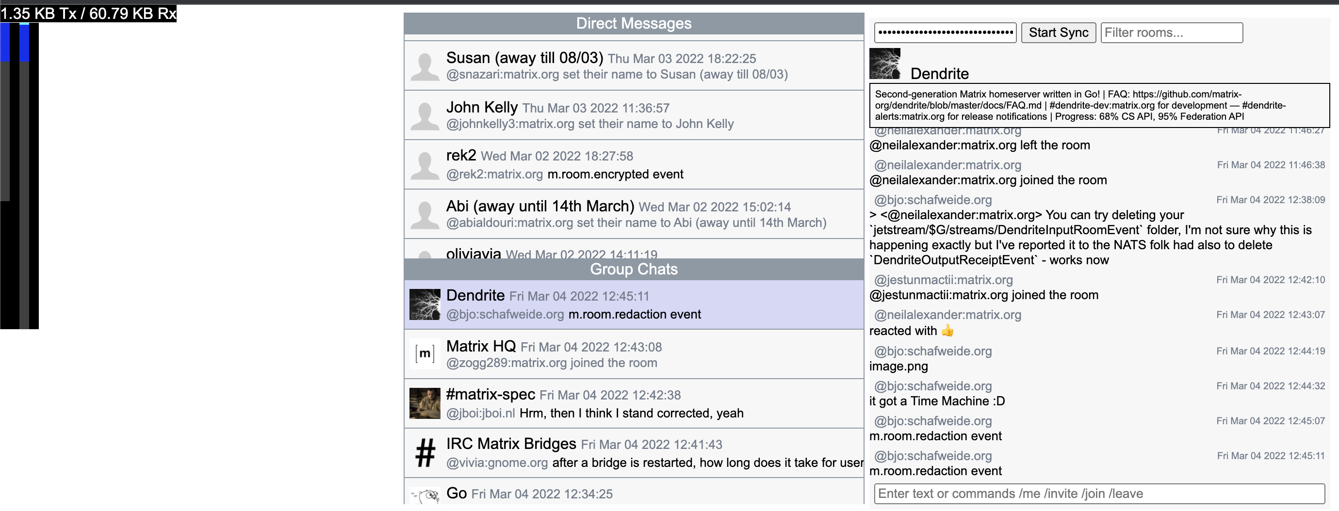 The net result is a basic but incredibly low bandwidth syncing client: 60.79KB to download an entire initial sync on matrix.itmanbu.com. Further improvements will be done on the client to make sure it doesn't scale with the number of rooms on the user's account (it currently does because it naively adds a placeholder for each room in the list) to ensure it remains extremely snappy and a vision for what Sliding Sync can do in practice, right now. Please continue giving feedback on MSC3575 or in