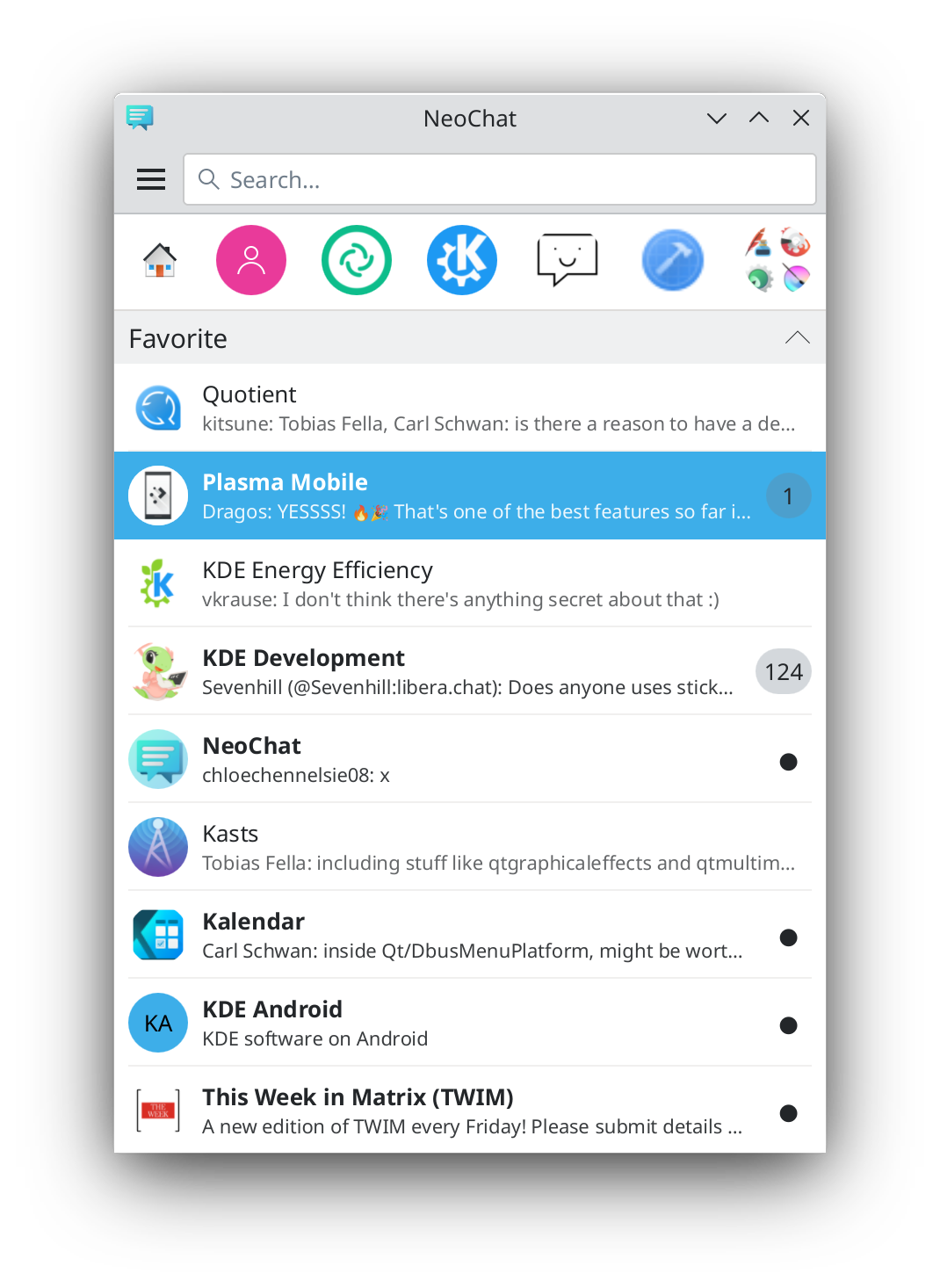 - Thanks to the GSoC work by Snehit, NeoChat now has some support for spaces: at the top of the room list, you can select a space to make the room list only show rooms of that space