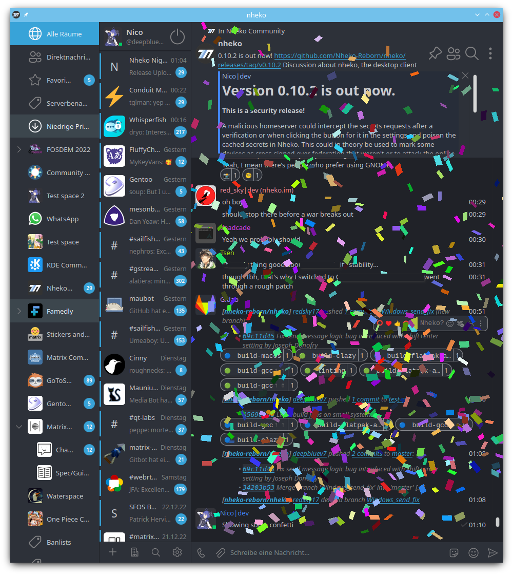As a dedicated user of all things KDE, I make heavy use of KRunner. Naturally, I wondered if KRunner could be extended to join Matrix. This idea led me to create a D-Bus API in nheko for use on Linux. While it currently only supports a few aspects of the full Matrix experience, this API allows external software to make use of some of nheko's functionality, including searching the room list, opening rooms, joining rooms, and creating DMs. Later, I also added support for setting status messages. Now you can write extensions for software such as KRunner or rofi. Alternately, you could make a plugin for your favorite game that sets your status message to let your friends know that you are busy (although no known plugins of this sort exist).