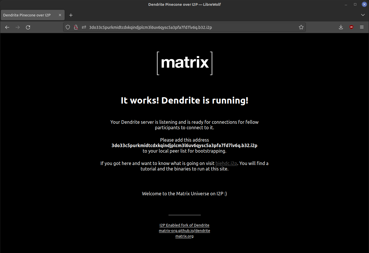 The last week i worked on getting Dendrite to work on the I2P Network. It makes use of the existing Pinecone infrastructure which gets enabled to dial on I2P with a small patch. This has the main advantage that servers will automatically discover each other if they share a node and you don't have to seek out others in the distributed network. I host a 24/7 Seednode for I2P right now. I have also put the work in to enable a landing page just like a monolith deployment would have and you can just browse to it. This hopefully increases the visibility too! However, it can also dial into the Clearnet too. It is hardcoded to the Seednode run by the matrix and dendrite developers themselves and it is disabled by default, but can be enabled with a command line switch. It effectively is making a bridge between the I2P Network and Clearnet. In order to bridge the gap between Pinecone based servers and normal matrix servers as well, I have also made a very simple matrix2matrix bridge which just connects to 2 (or more) Homeservers and exchanges the messages between 2 (or more) rooms. It also supports bridging and not-bridging files of any kind. You could add other networks too as long as you can tie them together with Pinecone. For example, the library i use to connect to I2P also supports Tor and it can be added to function just like the I2P implementation. All you need is something that exposes a HTTP Client and a listener. My personal goal is to make matrix independent from domain registrars, open ports, static IP addresses and anything that makes self hosting harder than it should be and thankfully all the software we need is already written, it just takes someone to tie it together.