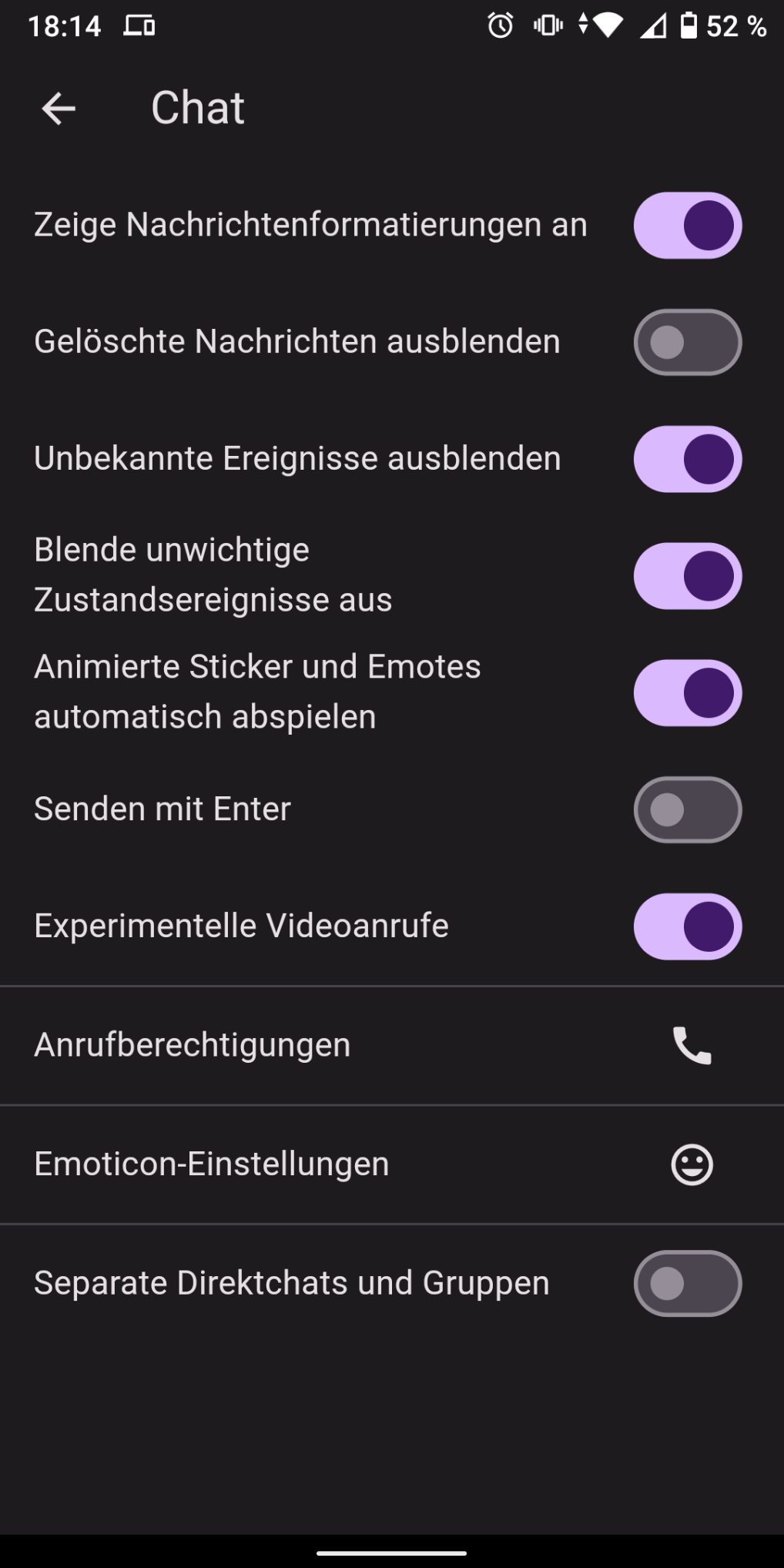 I have updated FluffyChat to the new Flutter version 3.7 which improves the performance and adds some more Material 3 components. Especially the new toggles look quite nice