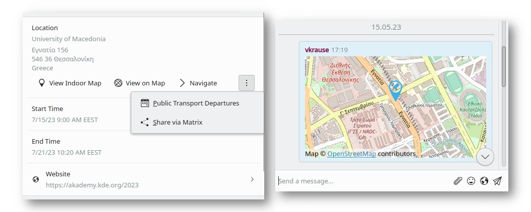 KDE Itinerary is a digital travel assistant that protects your privacy. It makes collecting all the information about your travel inside a single application easy and straightforward. KDE Itinerary is available for Plasma Mobile and Android. We release Itinerary at the same time as NeoChat, and in this release, apart of the integration of many more transport providers, it lets you connect your Matrix account with Itinerary to share your live location inside a Matrix room based on the on-board APIs from your train or flight.