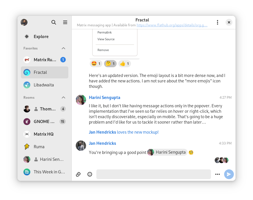 We just released Fractal 5! It is a full rewrite compared to Fractal 4, that now leverages GTK 4, libadwaita, and the Matrix Rust SDK. The two-and-a-half-year effort brings a new interface that fits all screens, big π₯οΈ or small π±, but should still look familiar to users of earlier versions.