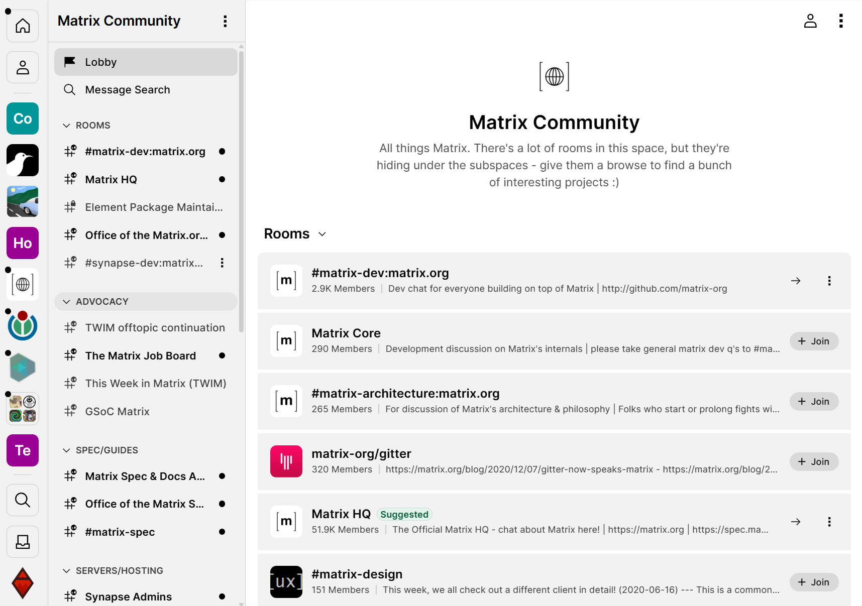 One of the additions is the Lobby feature, which helps you manage and navigate space rooms more efficiently. You can also now organize your spaces into folders, allowing for a cleaner and more structured space sidebar. For those managing large spaces, weβve also added the ability to customize the order of rooms and subspaces and the same order is visible to all space members. Space member can also float rooms with unread messages and activity to the top of room list by collapsing the category. Additionally, a new multi-room message search with filters is now available, making it simpler to find specific conversations across multiple rooms.