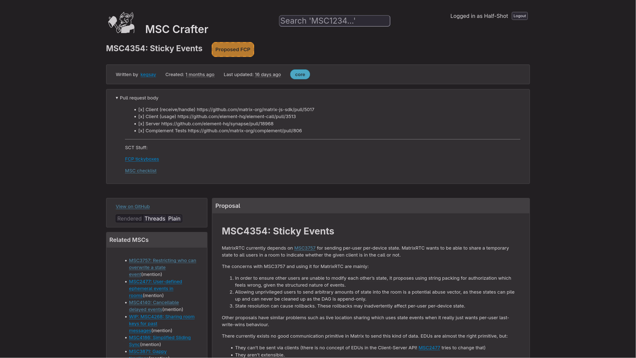 Otherwise, with the Matrix conference last weekend behind us, the SCT are continuing to focus on Matrix 2.0 MSCs with a more relaxed cadence.